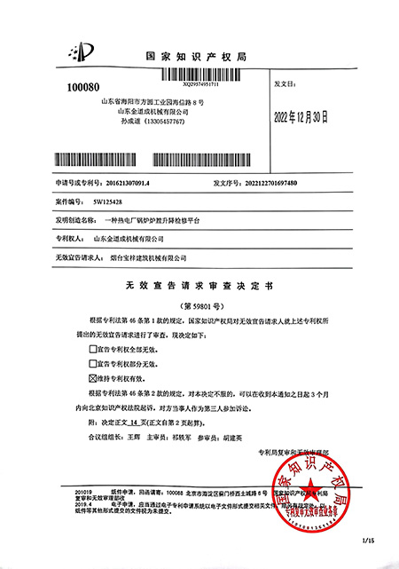 煙臺寶梓建筑機械有限公司抄襲的專利(專利號:201820409444.4),于2021年02月01日被國家知識產(chǎn)權(quán)局專利復(fù)審委員會宣告專利權(quán)全部無效。該公司惡意提起無效山東金道成機械有限公司有關(guān)專利的申請,經(jīng)過國家知識產(chǎn)權(quán)局專利復(fù)審委員會的有關(guān)審查程序,根據(jù)《專利法》第46條第1款的規(guī)定,于2022年12月30日對我公司兩項專利做出宣告專利權(quán)全部有效的審查決定。